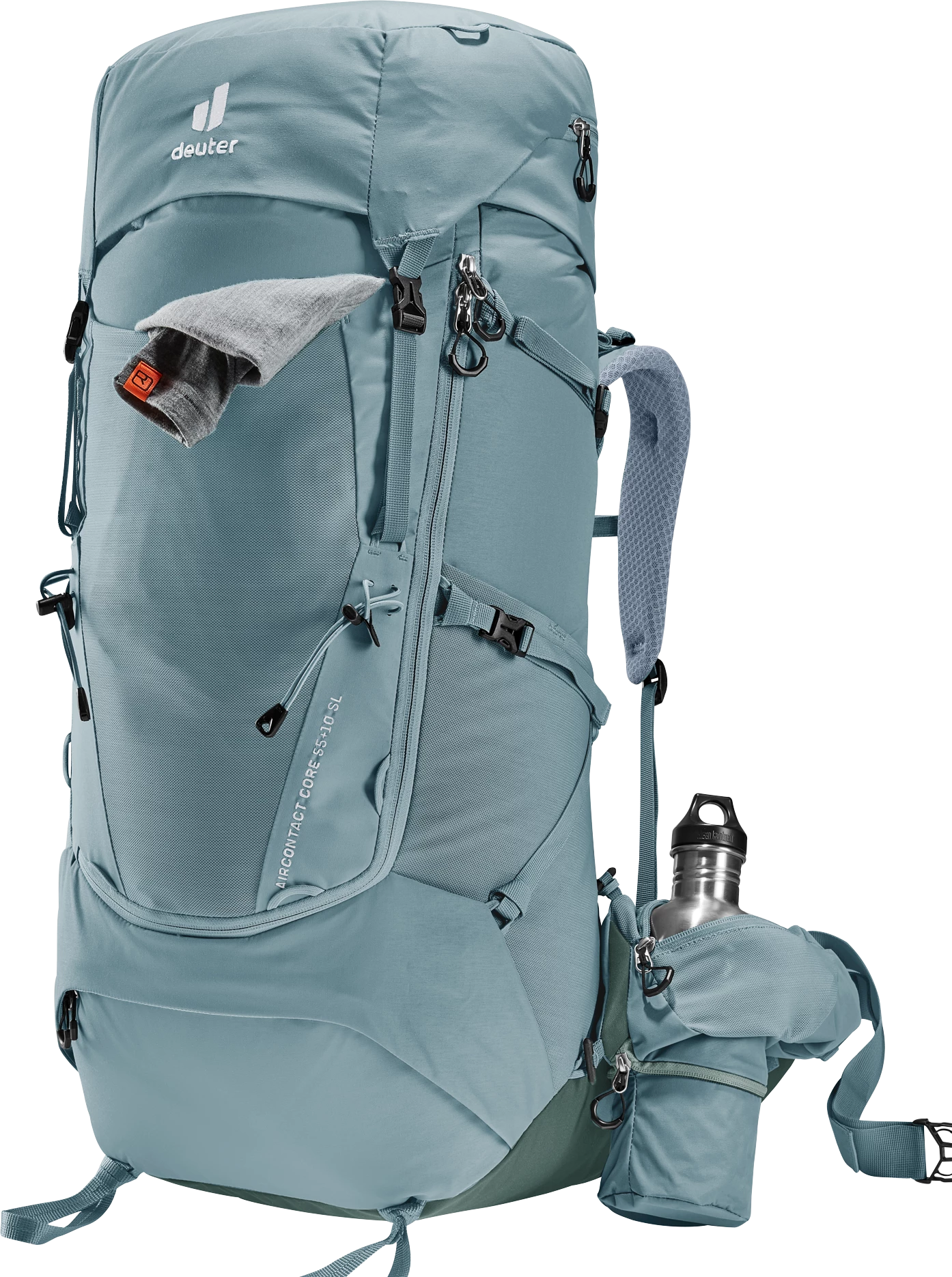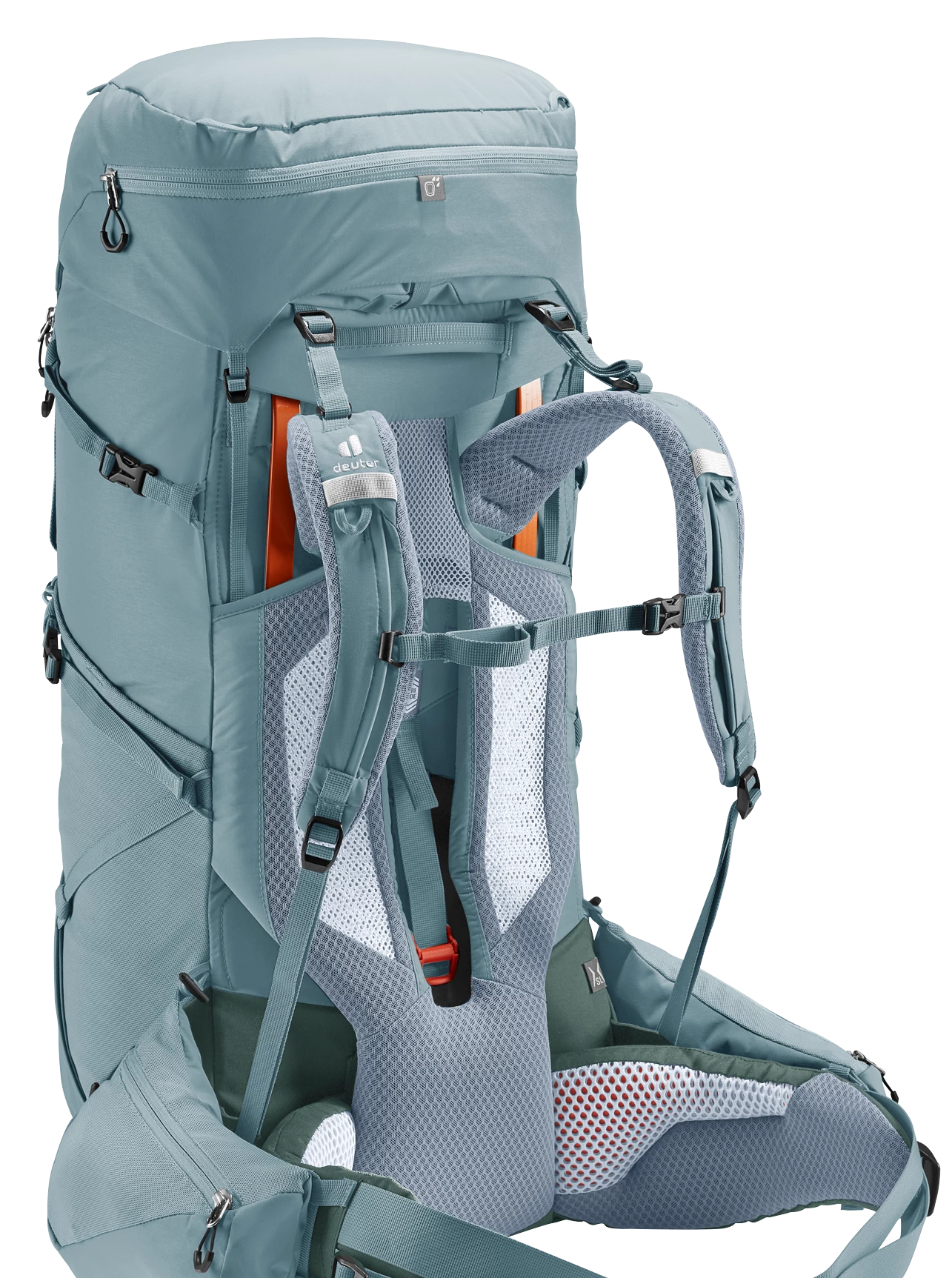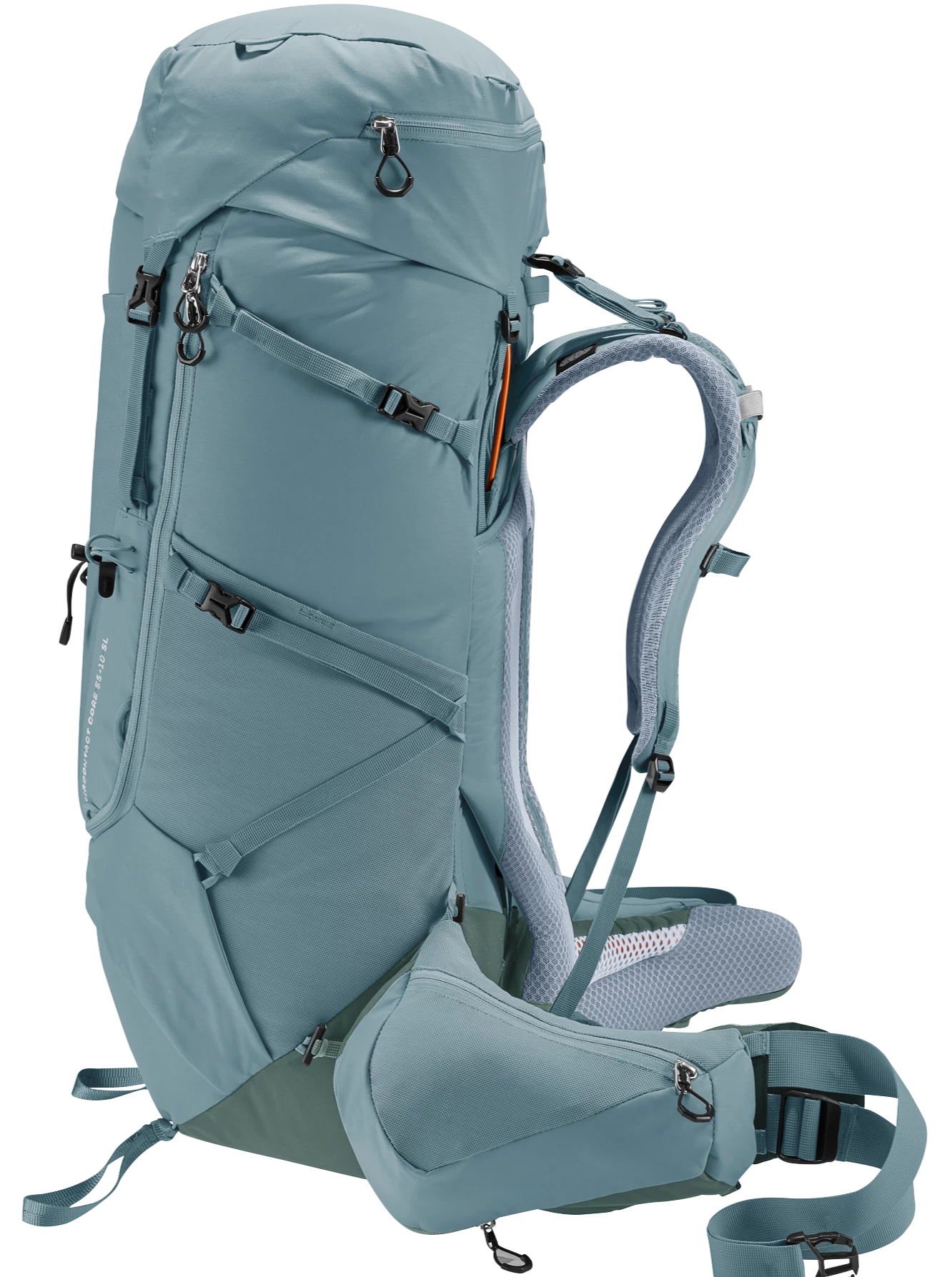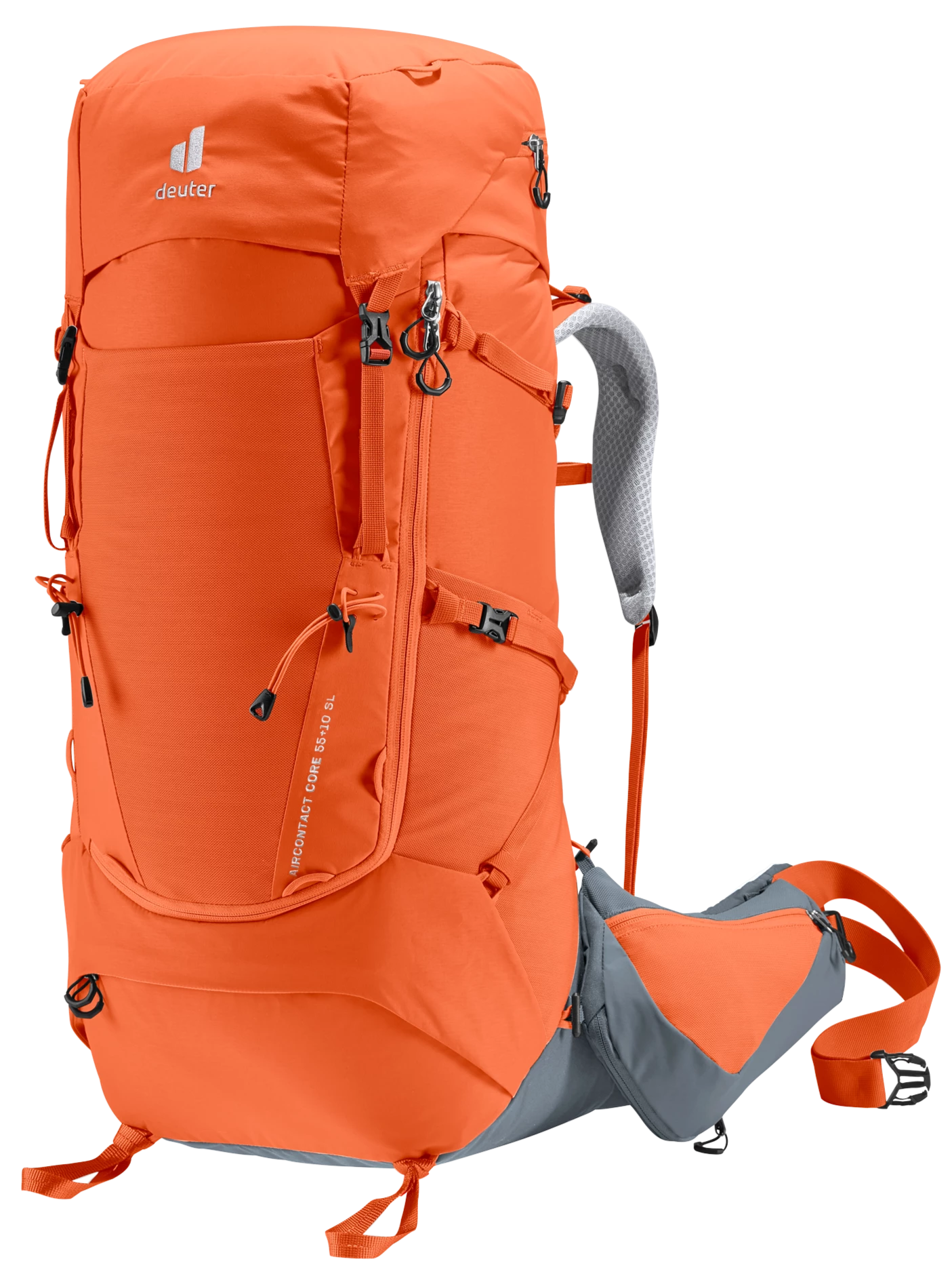 It’s superior carry comfort is down to the deuter Aircontact back system with Air Spacer mesh and a large ventilation channel, plus ergonomic ActiveFit shoulder straps and an adjustable sternum strap. The Y-shaped frame, mobile hip fins and ergonomic lumbar pad combine to distribute the load effectively. A full-length, J-shaped zipper on the front makes contents easy to locate lower down in the main compartment. While large, detachable hip fin pockets (3 L) provide extra storage and keep items within reach. A zip-out 1.5L bottle holster also lets you hydrate on the move. Depending on what you are doing, the modular gear straps on this pack can be positioned to attach a range of items – to attach a sleeping mat or tent, or to compress the load in the base of the pack.