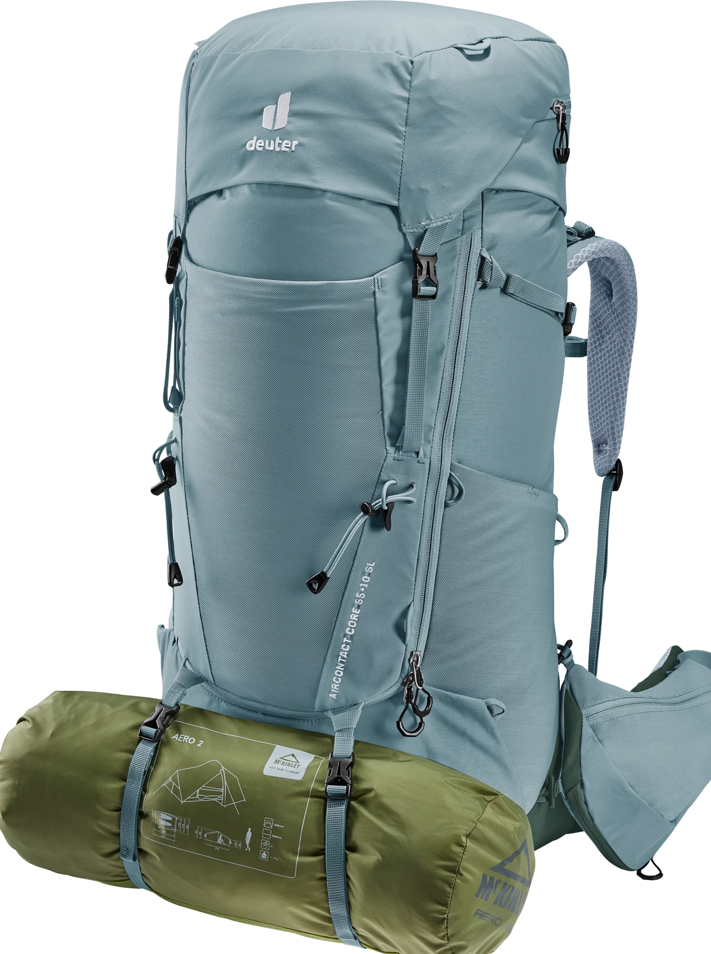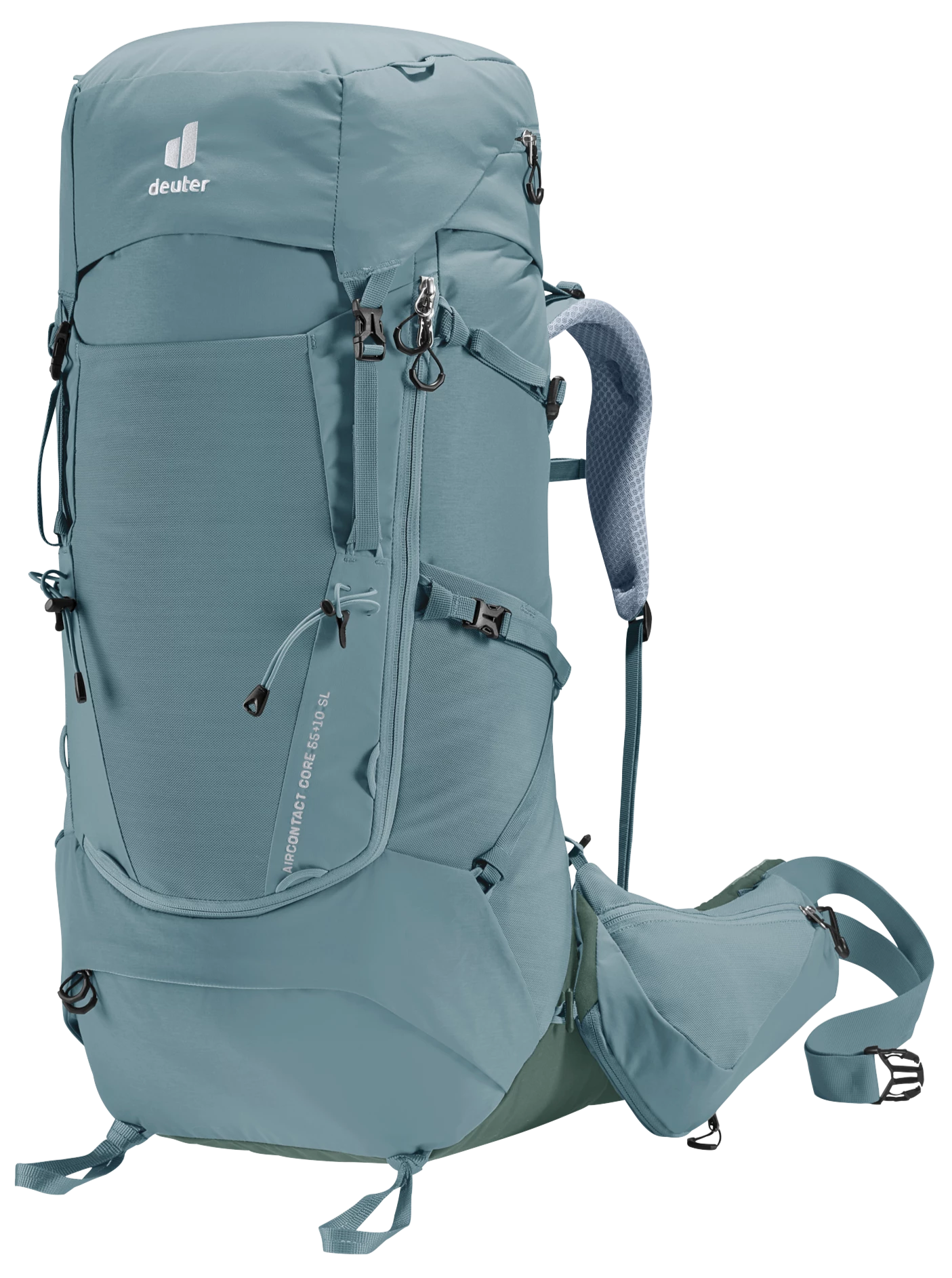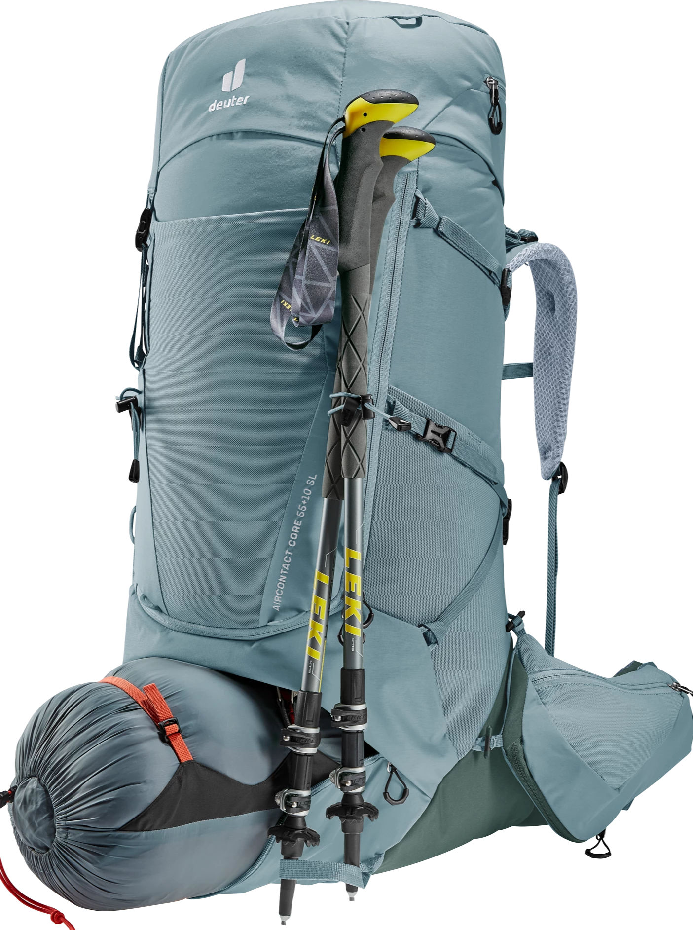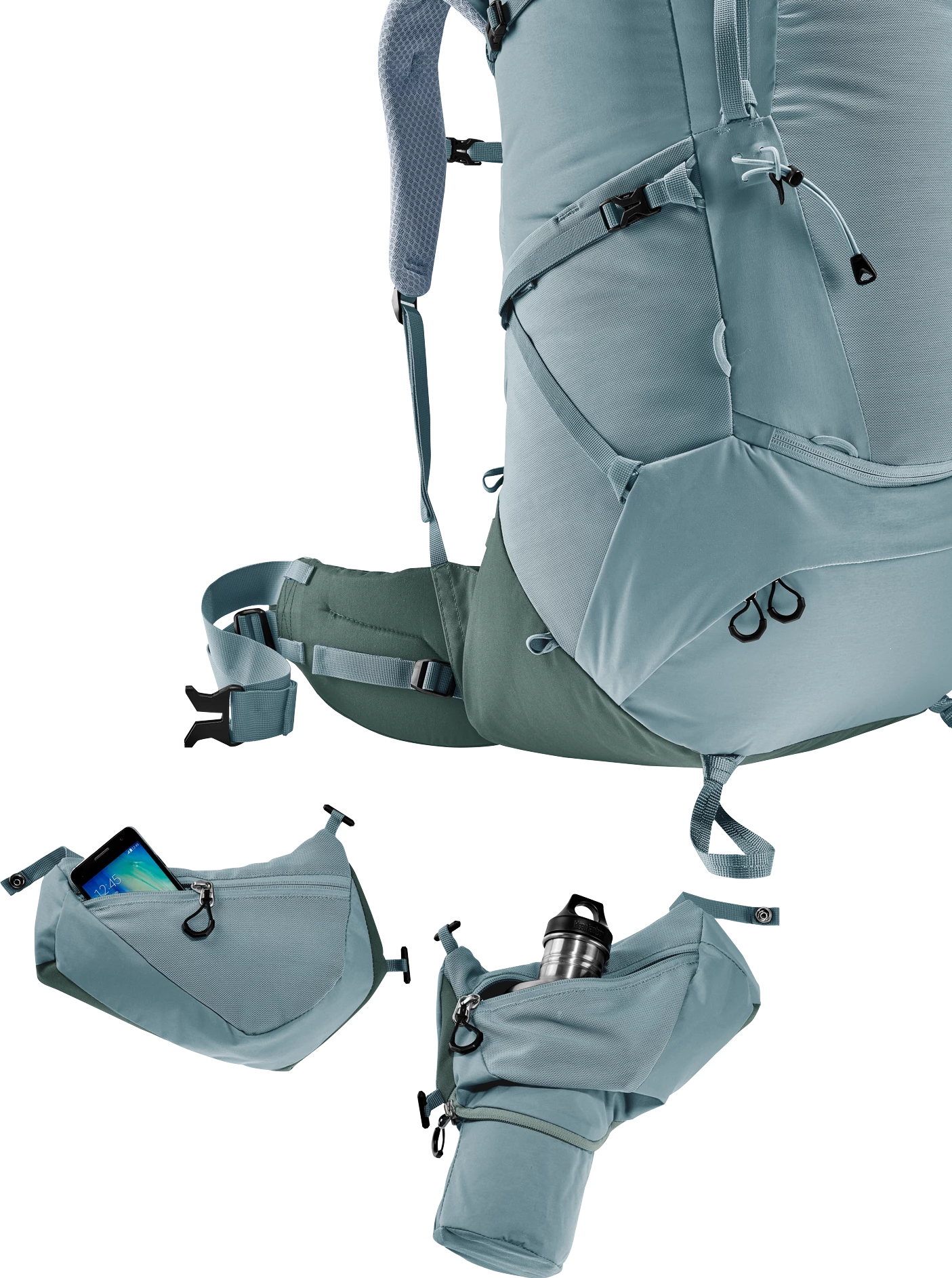 It’s superior carry comfort is down to the deuter Aircontact back system with Air Spacer mesh and a large ventilation channel, plus ergonomic ActiveFit shoulder straps and an adjustable sternum strap. The Y-shaped frame, mobile hip fins and ergonomic lumbar pad combine to distribute the load effectively. A full-length, J-shaped zipper on the front makes contents easy to locate lower down in the main compartment. While large, detachable hip fin pockets (3 L) provide extra storage and keep items within reach. A zip-out 1.5L bottle holster also lets you hydrate on the move. Depending on what you are doing, the modular gear straps on this pack can be positioned to attach a range of items – to attach a sleeping mat or tent, or to compress the load in the base of the pack.