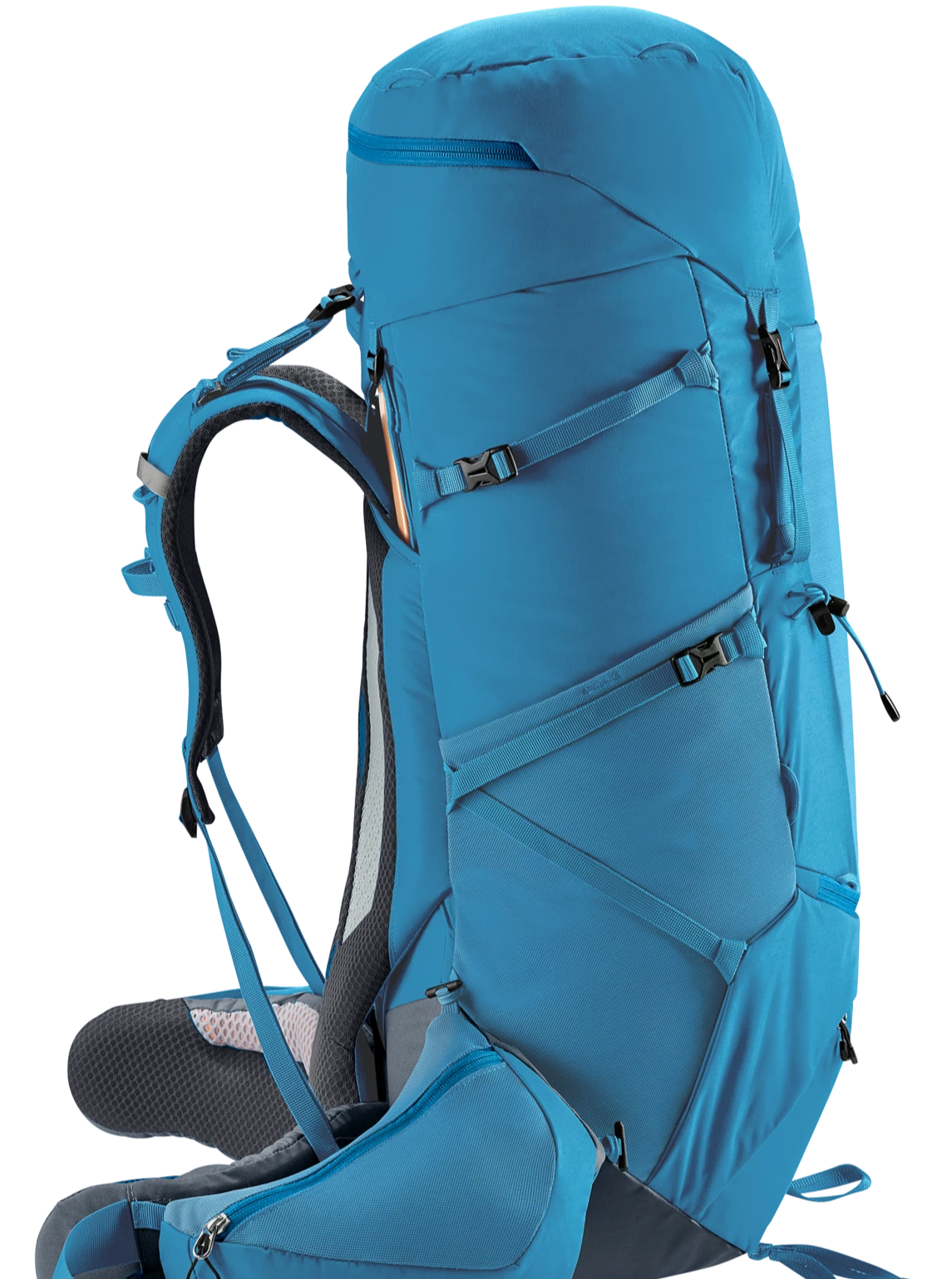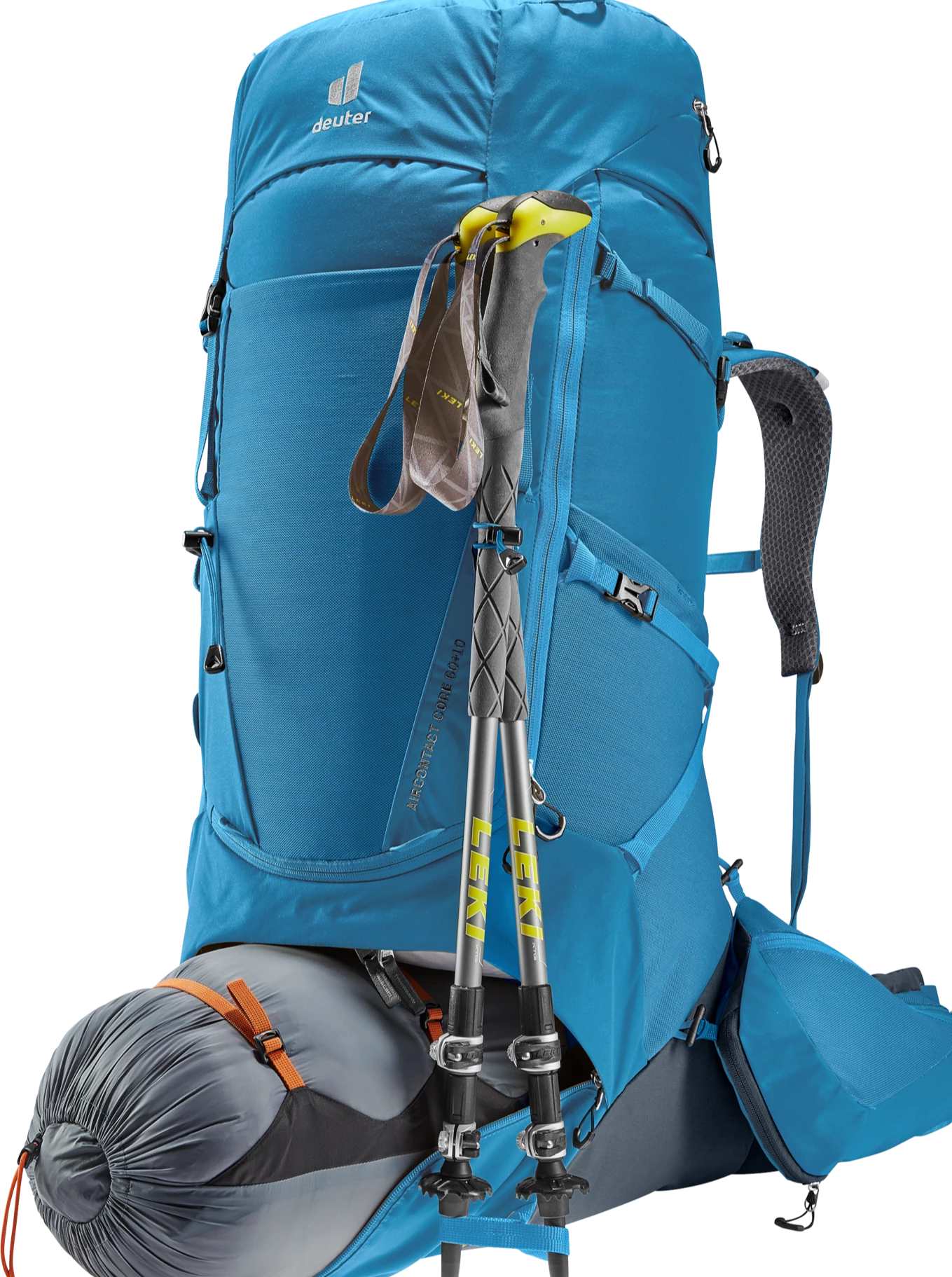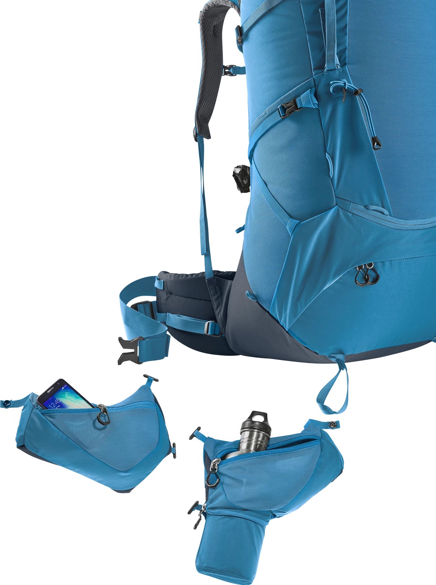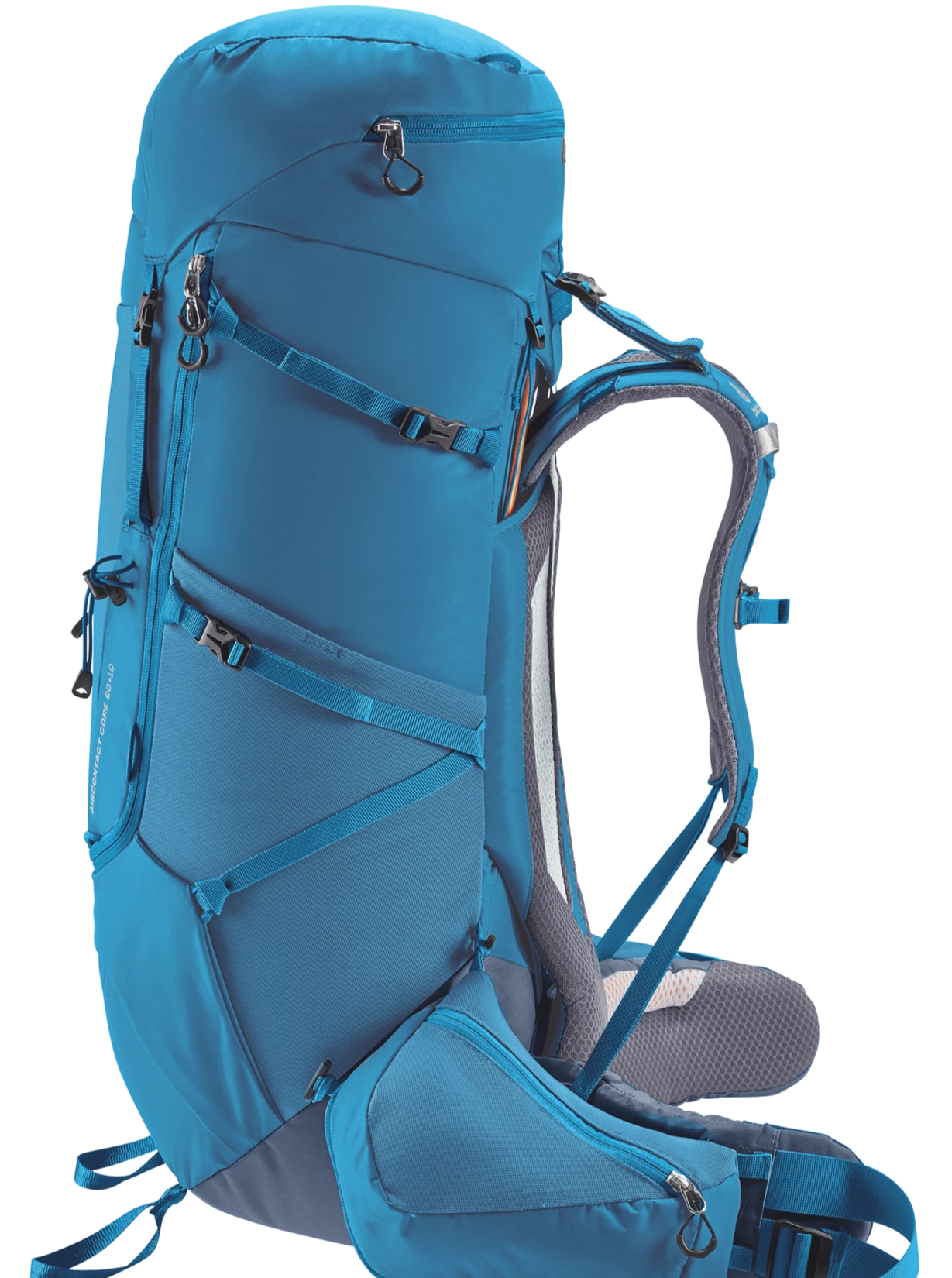 It’s superior carry comfort is down to the Deuter Aircontact back system with Air Spacer mesh and a large ventilation channel, plus ergonomic ActiveFit shoulder straps and an adjustable sternum strap. The Y-shaped frame, mobile hip fins and ergonomic lumbar pad combine to distribute the load effectively. A full-length, J-shaped zipper on the front makes contents easy to locate lower down in the main compartment. While large, detachabel hip fin pockets (3 L) provide extra storage and keep itmes within reach. A zip-out 1.5 L bottle bottle holster also lets you hydrate on the move. Depending on what you’re doing, the modular gear straps on this pack can be positioned to attach a range of items – to attach a sleeping mat or tent, or to compress the loadin the base of the pack.