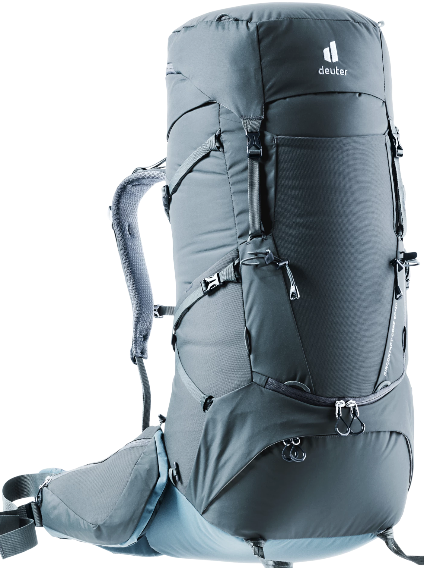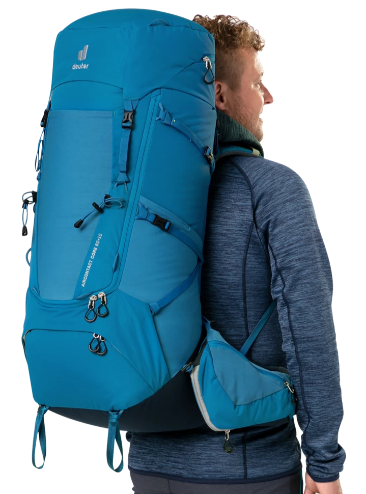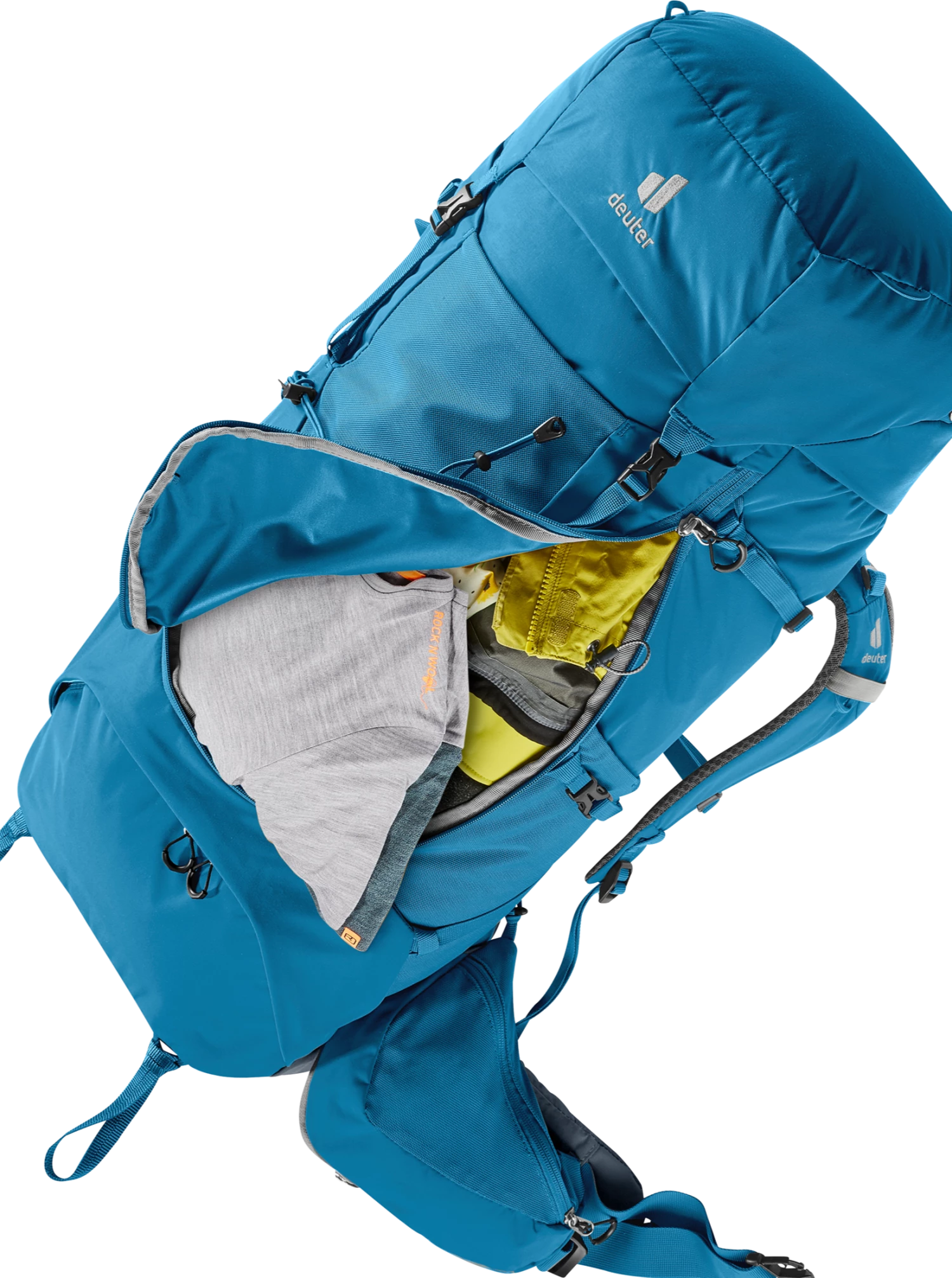 It’s superior carry comfort is down to the Deuter Aircontact back system with Air Spacer mesh and a large ventilation channel, plus ergonomic ActiveFit shoulder straps and an adjustable sternum strap. The Y-shaped frame, mobile hip fins and ergonomic lumbar pad combine to distribute the load effectively. A full-length, J-shaped zipper on the front makes contents easy to locate lower down in the main compartment. While large, detachabel hip fin pockets (3 L) provide extra storage and keep itmes within reach. A zip-out 1.5 L bottle bottle holster also lets you hydrate on the move. Depending on what you’re doing, the modular gear straps on this pack can be positioned to attach a range of items – to attach a sleeping mat or tent, or to compress the loadin the base of the pack.