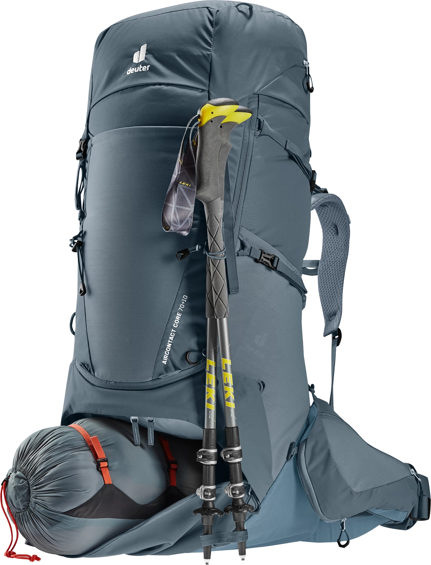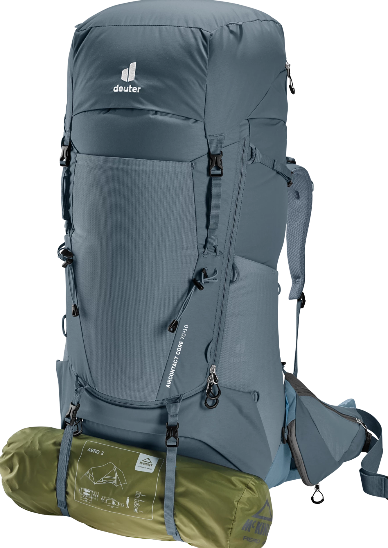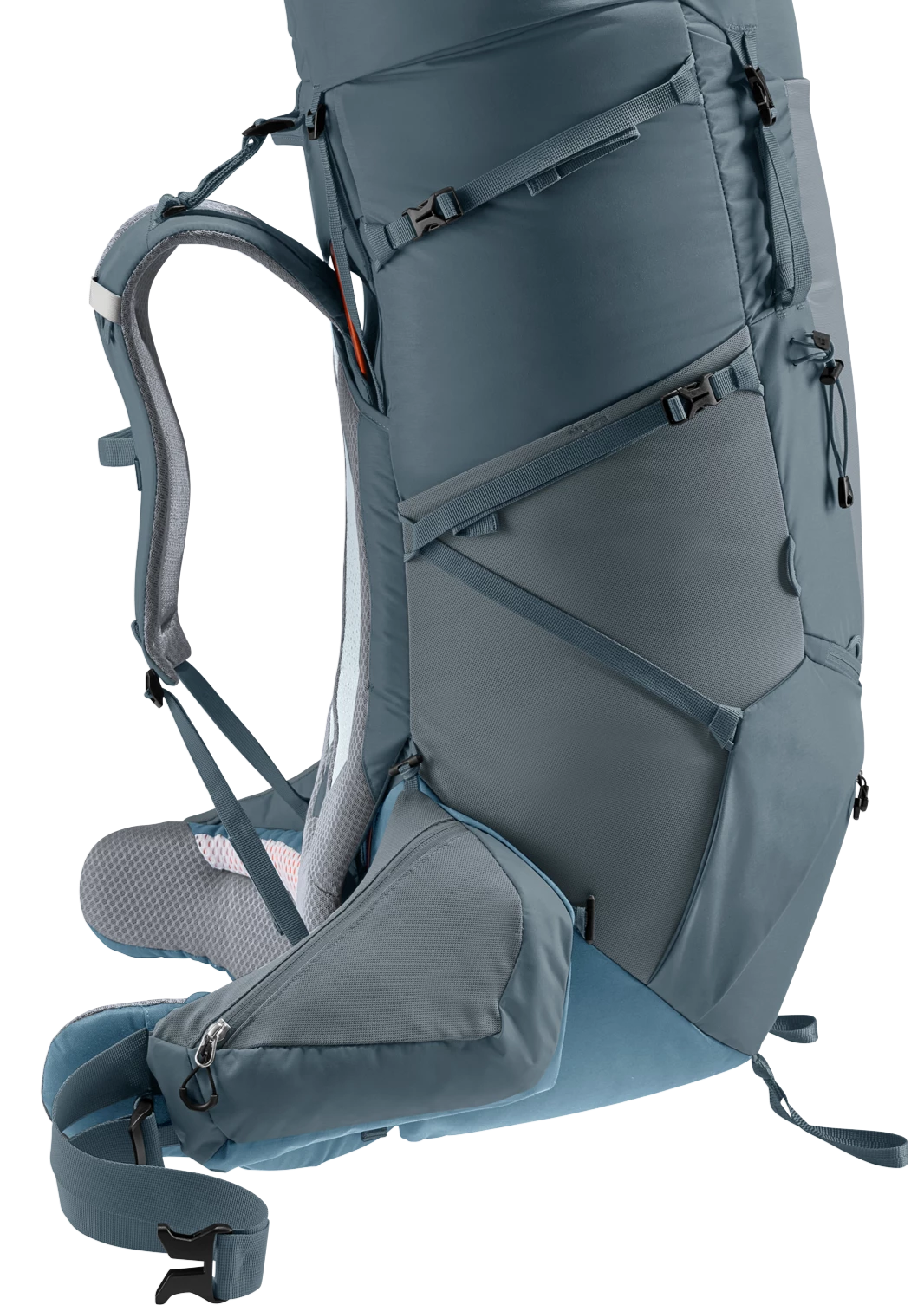 It’s superior carry comfort is down to the Deuter Aircontact back system with Air Spacer mesh and large ventilation channel, plus ergonomic Active Fit shoulder straps and an adjustable sternum strap. The Y-shaped frame, mobile hip fins and ergonomic lumbar pad combine to distribute the load effectively. A full-length, J-shaped zipper on the front makes contents easy to locate lower down in the main compartment. While large, detachable hip fin pockets (3 L) provide extra storage and keep items within reach. A zip-out 1.5 L bottle holster also lets you hydrate on the move. Depending on what you’re doing, the modular gear straps on this pack can be positioned to attach a range of items – to attach a sleeping mat or tent, or to compress the load in the base of the pack.