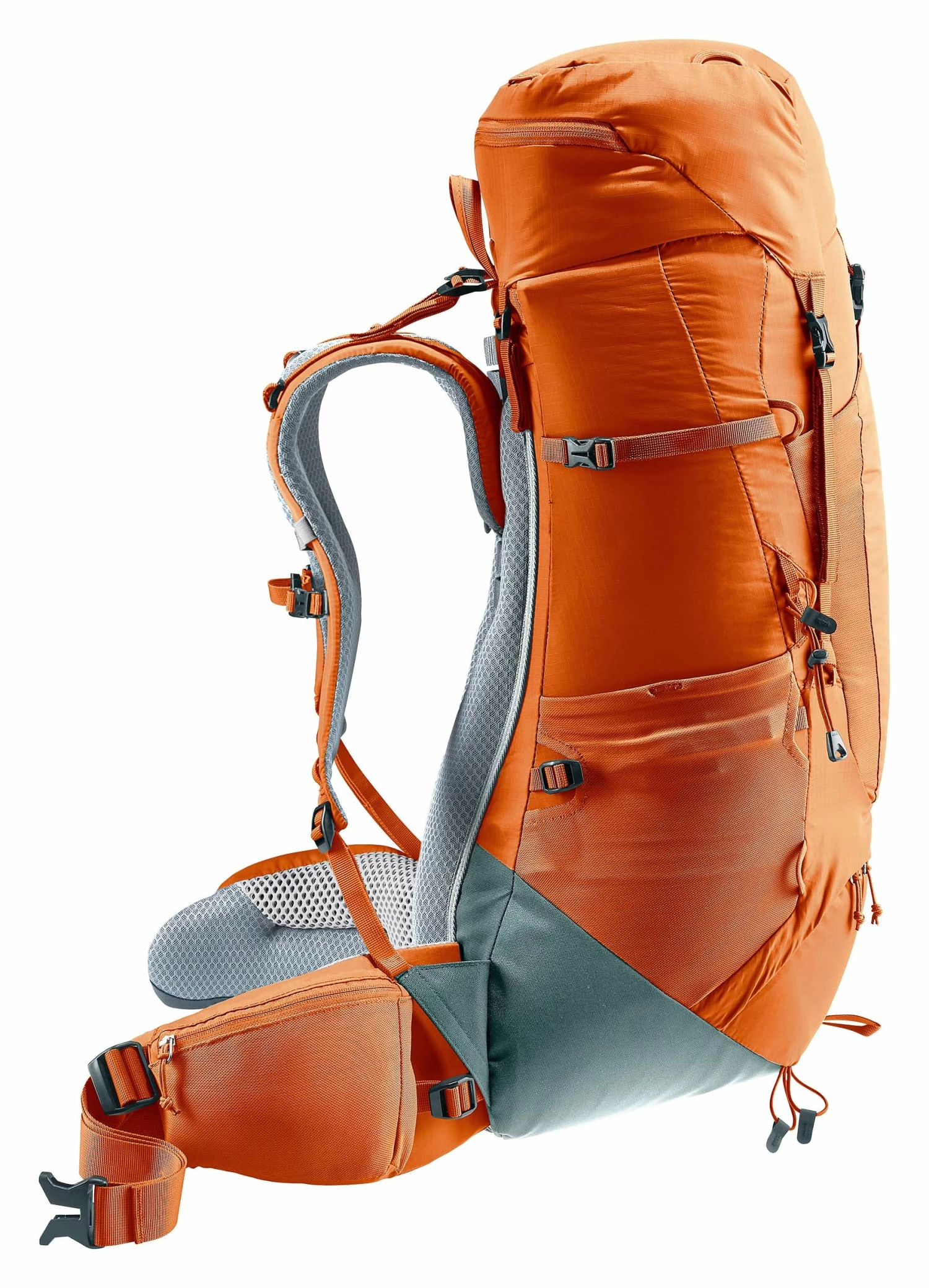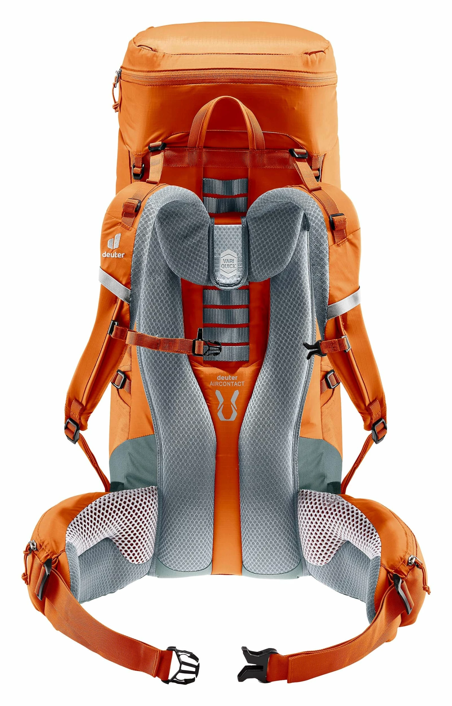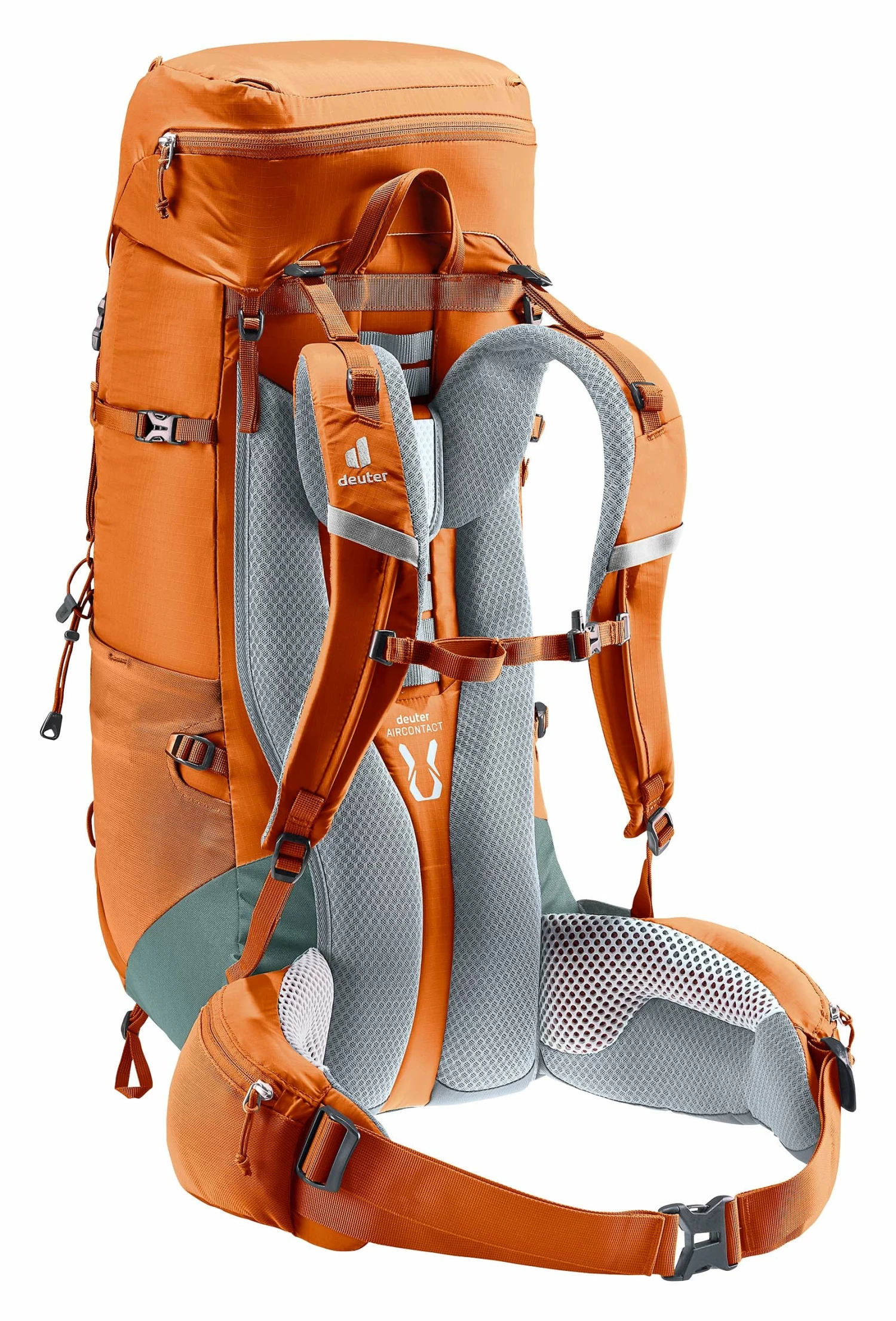 The Deuter Aircontact Lite 50+10 is a fully functional backpack that is ideal for trekking, or more demanding daywalks, or carrying equipment to the crag. Could easily be used as an overnight pack if you pack light. Bottom compartment and access, top-loading style. This is a lighter design than Deuter’s AirContact series.