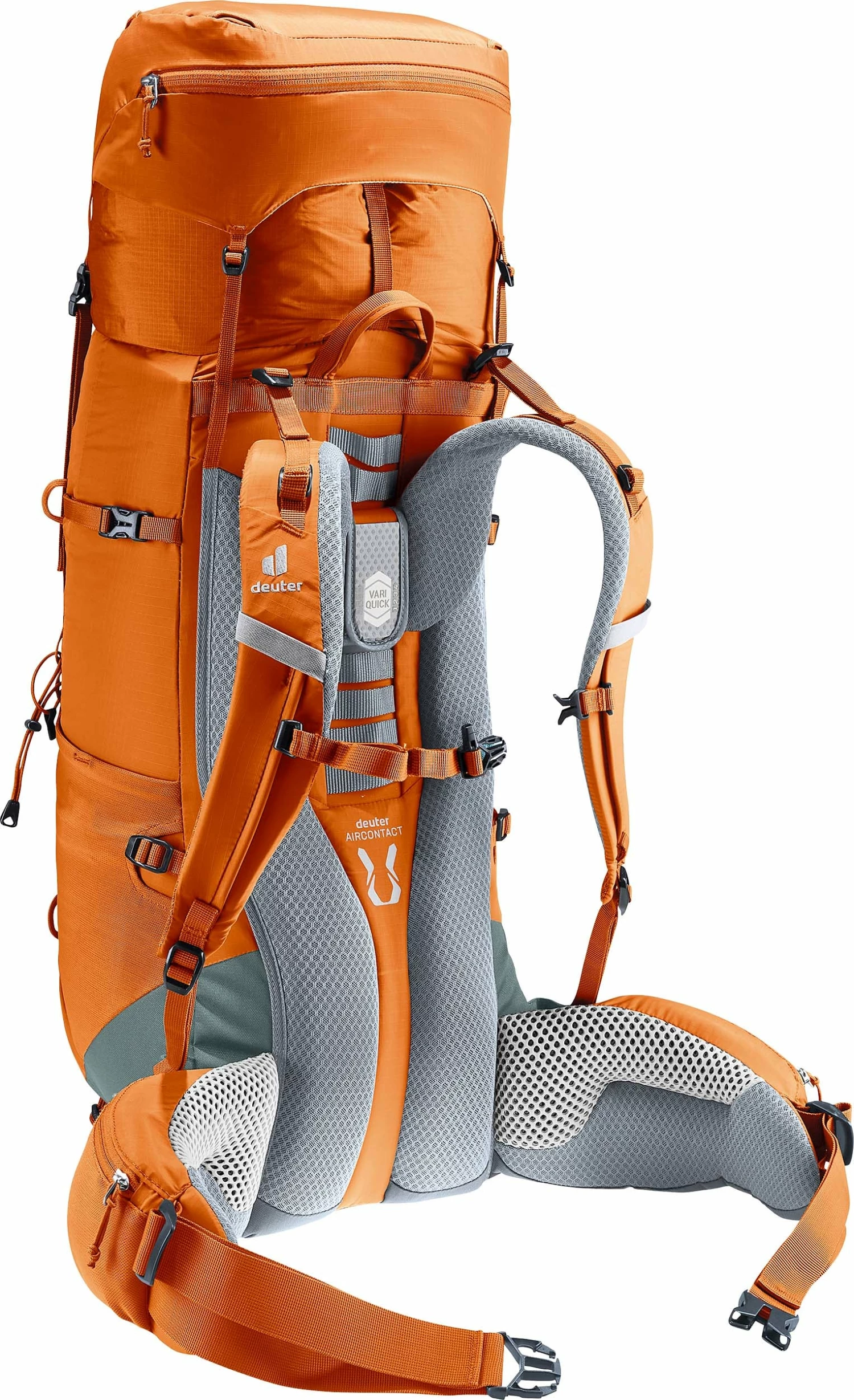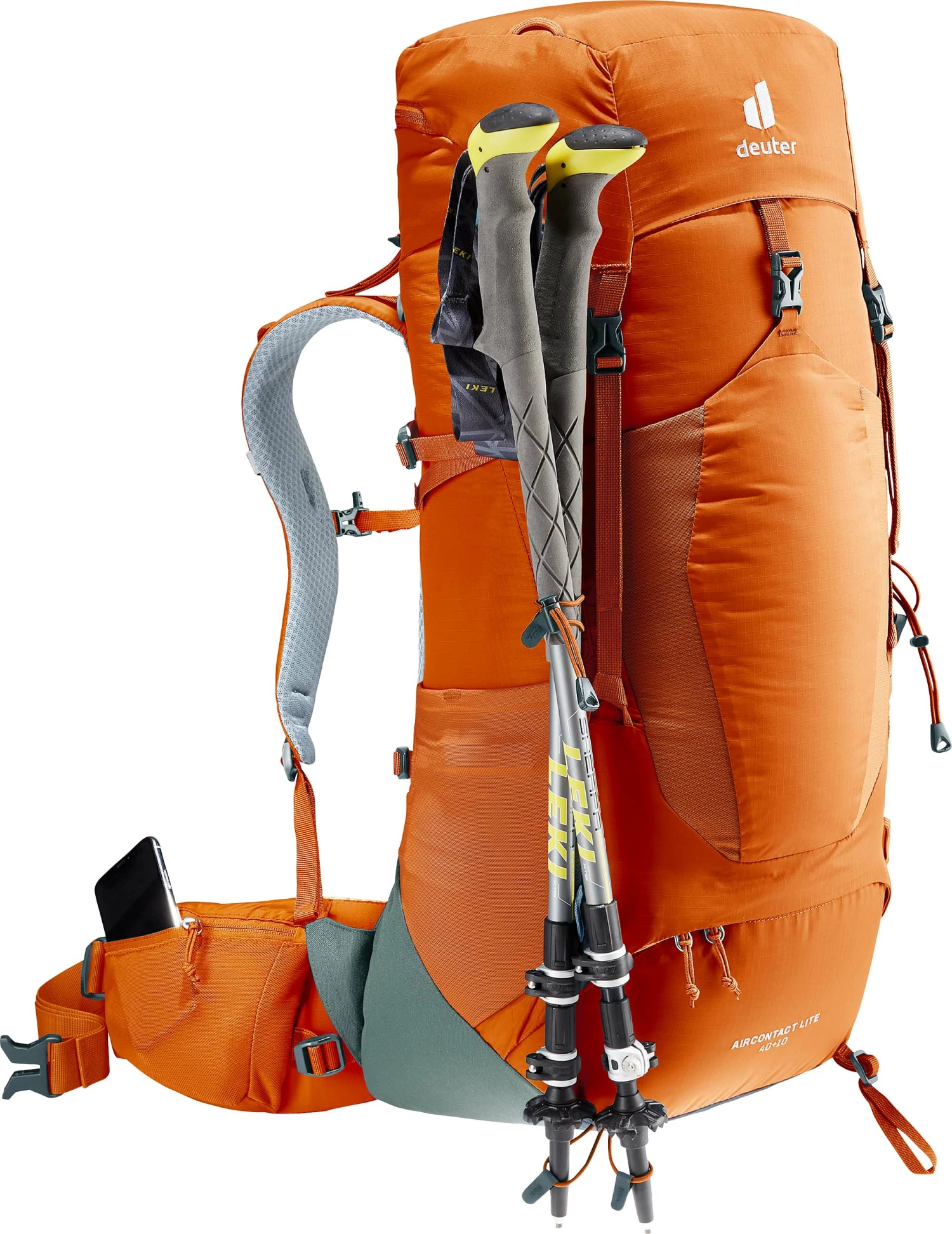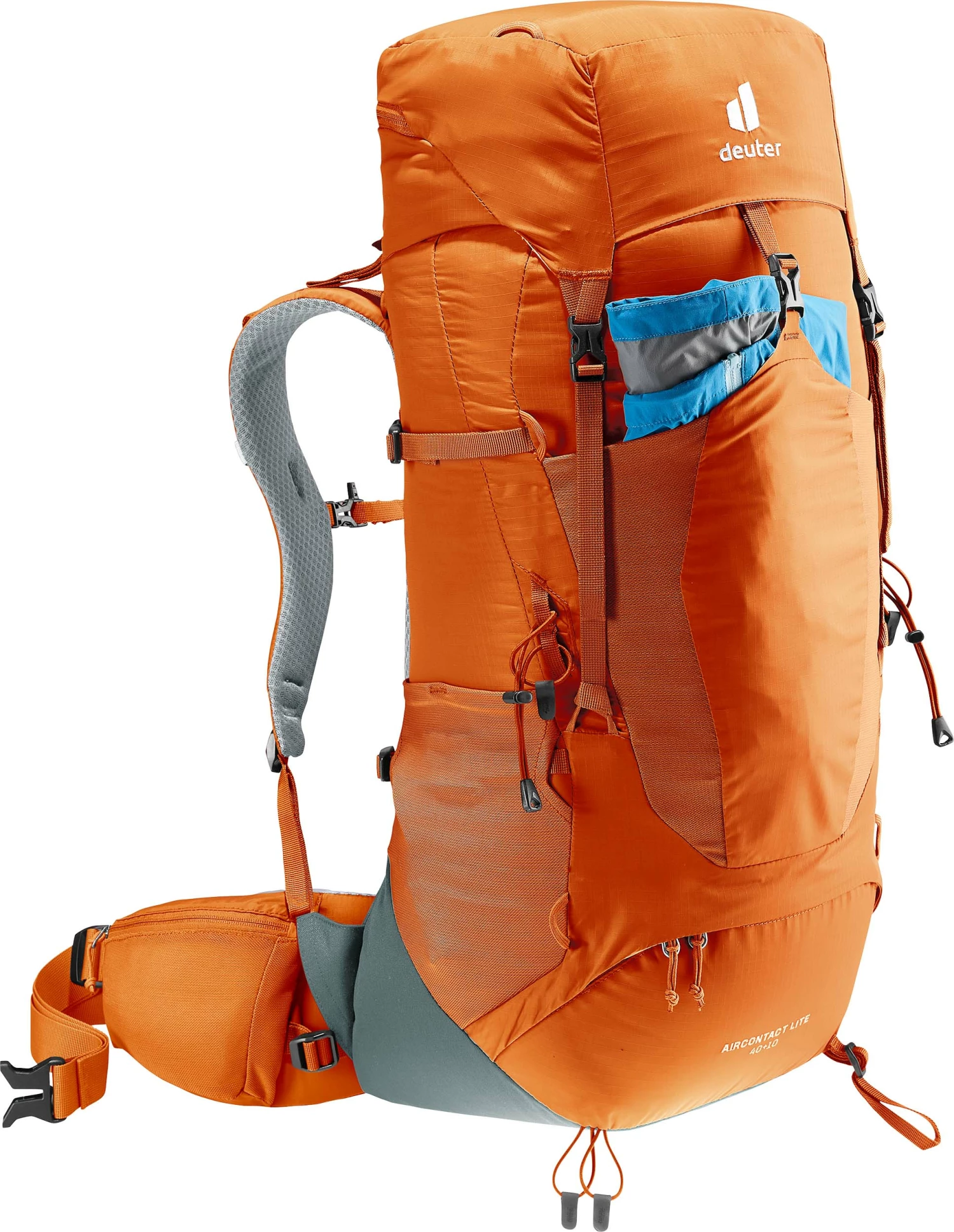 The Deuter Aircontact Lite 50+10 is a fully functional backpack that is ideal for trekking, or more demanding daywalks, or carrying equipment to the crag. Could easily be used as an overnight pack if you pack light. Bottom compartment and access, top-loading style. This is a lighter design than Deuter’s AirContact series.