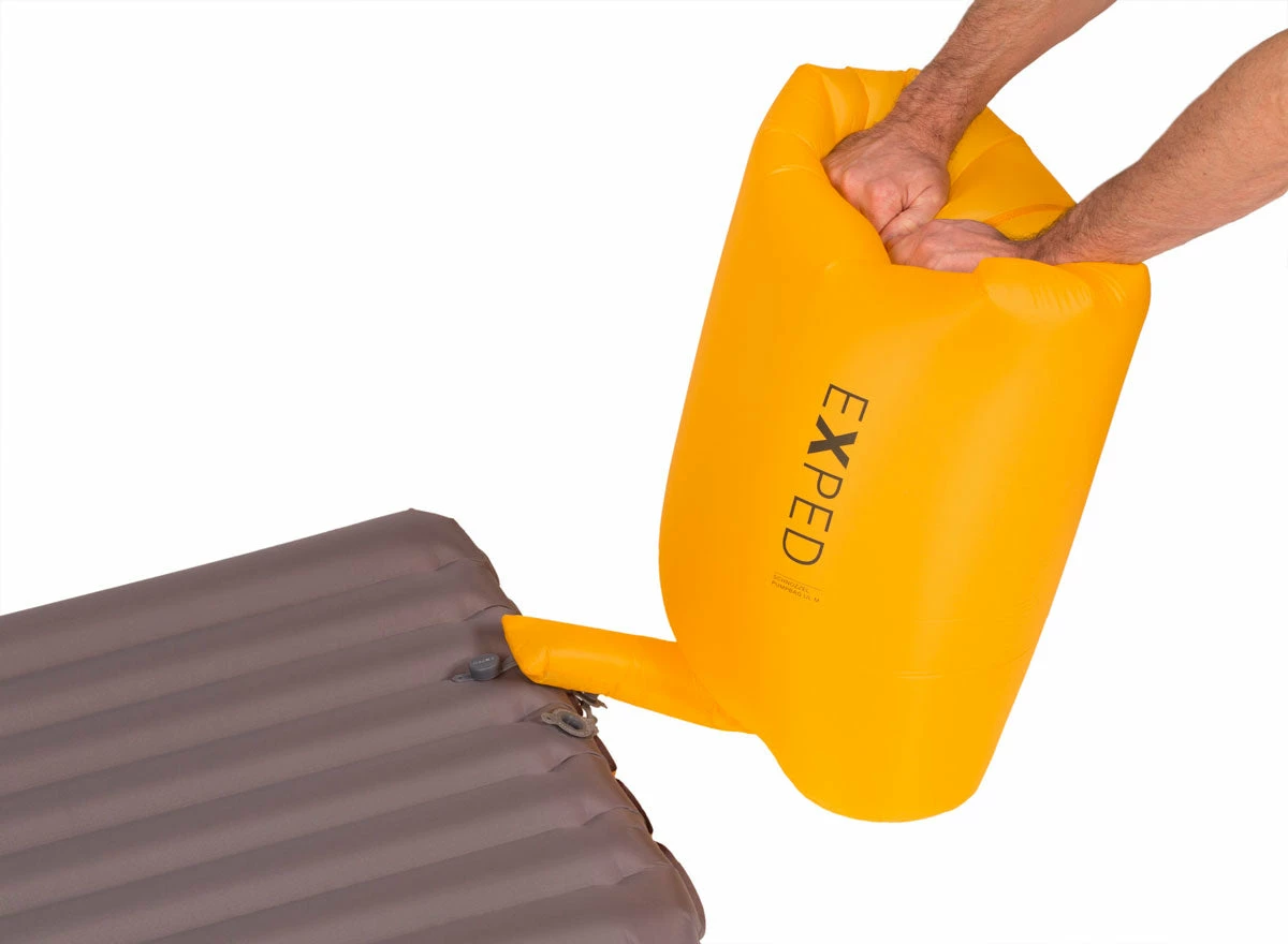 The Schnozzel Pumpbag ensures quick, hygienic, moisture-free inflation of Exped mats, preventing mold development and maximizing insulation (because wet insulation is less effective). It also serves as a waterproof compression drybag to keep your sleeping bag and clothing dry.