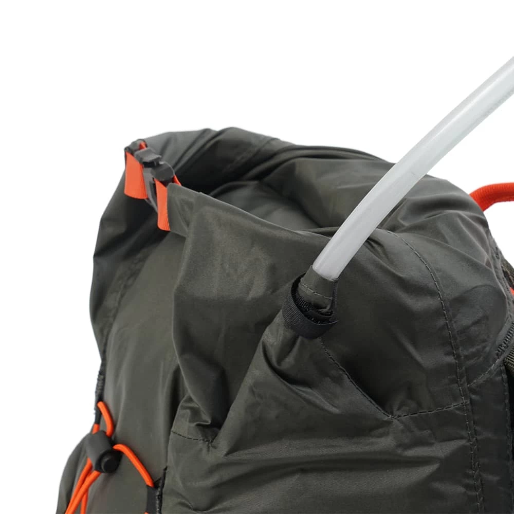 - Unique, waterproof outlet for hydration system hose in rolltop style