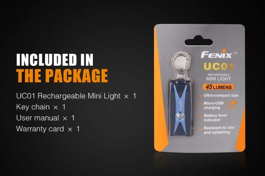 Fenix UC01 is a mini flashlight that is micro USB rechargeable. It features a high-performance LED, which delivers a maximum of 45 lumens on high and 50 hours of runtime on its lowest brightness level. The simple three output levels are all controlled by the one stainless steel switch. Perfect for every day use, the UC01 rechargeable mini flashlight is water resistant and has a battery level indicator, so you will always know your battery status.