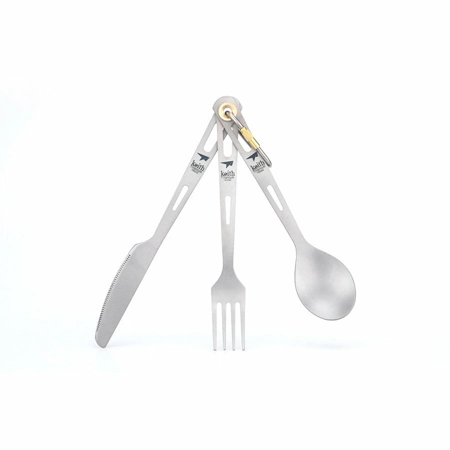 Lightweight titanium cutlery set including a knife, fork and spoon. Includes microfibre drawstring bag.