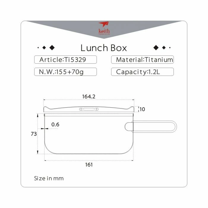 The Keith Lunch Box 1.2L (Ti5329) is made of pure titanium. With no lining or coatings it is tasteless, odourless and non-toxic. Although originally designed for hiking and camping its use can be extended into the office, home or for food on the go.Â