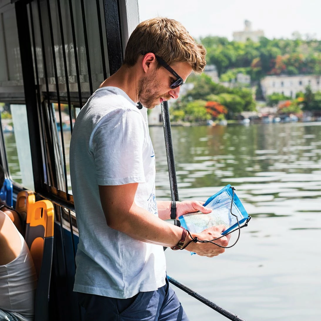 The IPX7 rated constrcution prevents the ingression of water, sand and dirt. Insert your belongings into the case, run your thumb and index finger along each side of the two track LocTop closure and shut with the secure fastening. You can either wear the case around your neck using the lanyard or secure it to your gear using the four lash points.