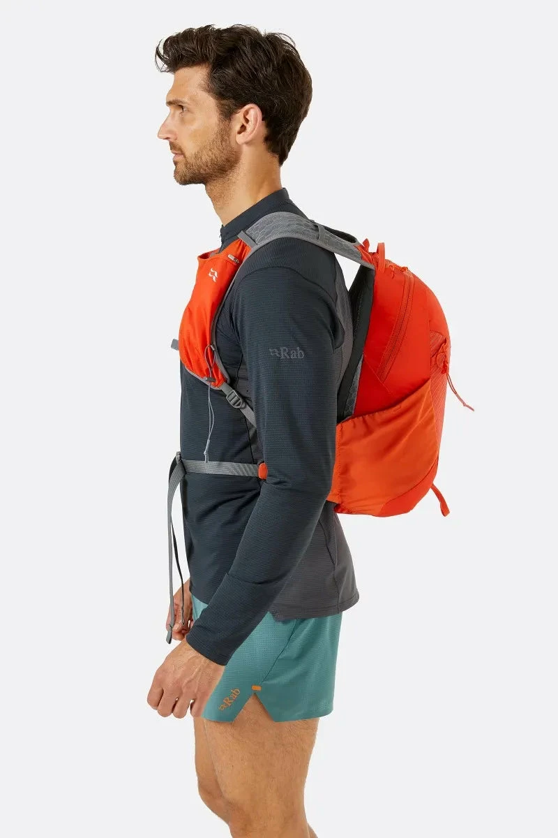 The Aeon LT 12 has on harness walking pole attachment and stretchy side stash pockets, enabling quick access to kit for adapting to oncoming terrain and turbulent weather. It has an addititonal walking pole attachment on the front of the pack, a front stack pocket ideal for wet gear, and side compression straps to secure the contents. Hydration compatible with space for 3L bladder, with zipped harness pockets for storing snacks, gels, or flasks.
