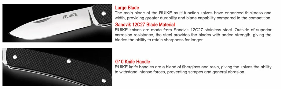 - G10 Knife Handle – RUIKE knife handles are a blend of fiberglass and resin, giving the knives the ability to withstand intense forces, preventing scrapes and general abrasion.